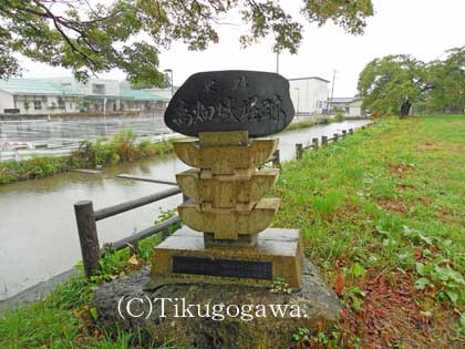 (安部右馬助の碑。右馬助は上杉景勝の家臣で宮内地区の町割・開墾・治水事業を行い、領内の発展に尽力した)