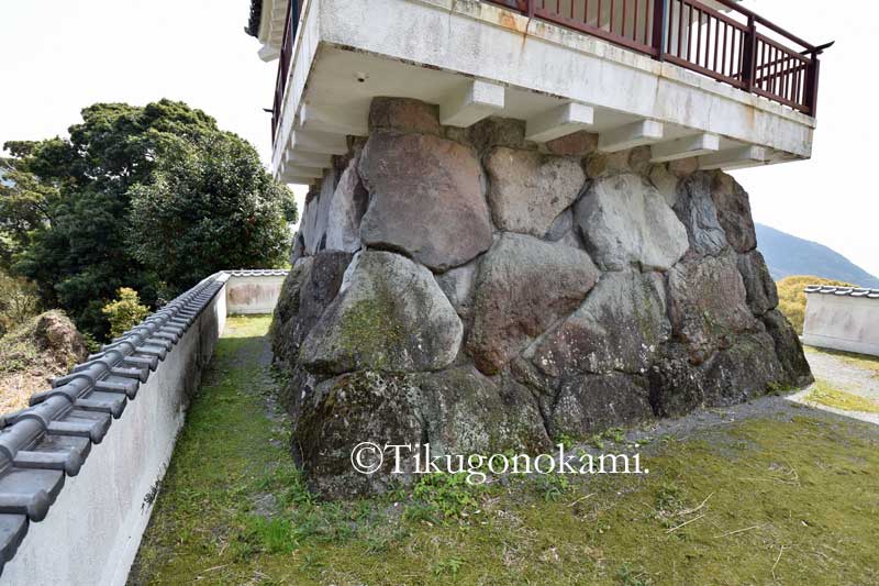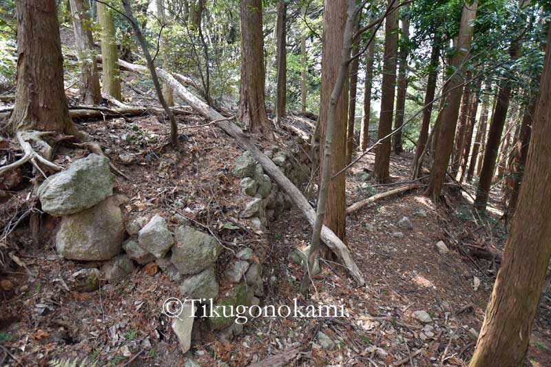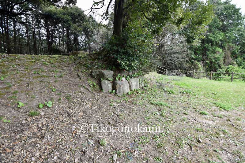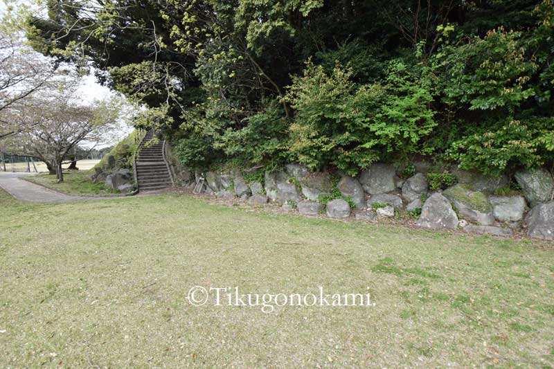 (城の南側。さすがにこの石垣は公園整備の時のものだろう。曲輪もこのような形だったのかも不明。最後の写真の石は古そうだが、ここは近世には畑になっており昭和時代には蜜柑畑があった。石はその時のものか)