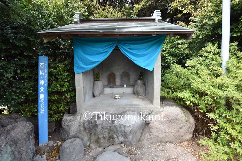 (模擬天守の近くにある石仏・神父像。キリシタンの遺物で市指定文化財になっている)