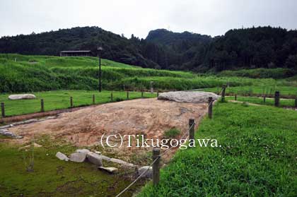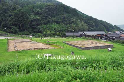 (金堂跡。瓦積みの周囲に石を配置するという形で復元されているが、これは朝鮮式で朝鮮半島からの渡来人が関わっていたのではないかと推測されている)