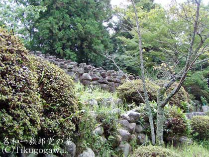 案内:長綱寺の裏山にある。名和軍が船上山で鎌倉幕府軍と戦って戦死した一族を弔ったお墓。足利氏や北条氏の残党が荒らすのを恐れて埋められたが、昭和5年の山林開発で見つかった。当時は何の墓か分からなかったが名和長年の妹婿の家に伝わる古文書によって判明した。